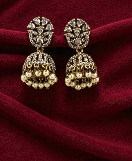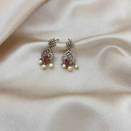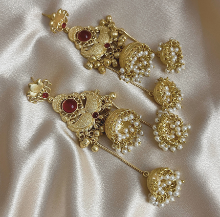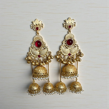 Aroopa Royal Red Temple Multi-Jhumka Earrings with Pearl Drops